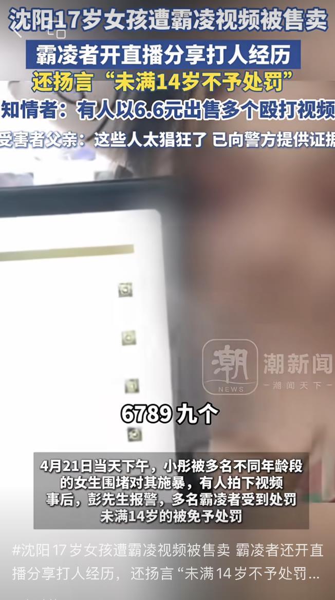 8月4日,辽宁的彭先生向记者反映称,他17岁的女儿小彤(化名)于3个月前在校外遭受多名外校学生霸凌,霸凌者竟然开直播分享打人经历,还通过网络以6.6元的价格售卖小彤被殴打的现场视频,扬言“未满14岁不予处罚”。