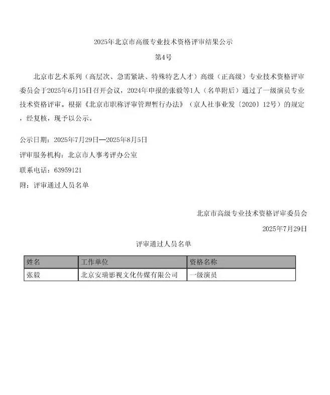 7月29日,北京市高级专业技术资格评审委员会发布公示,张译(公示名“张毅”)通过一级演员(正高级职称)专业技术资格评审。
