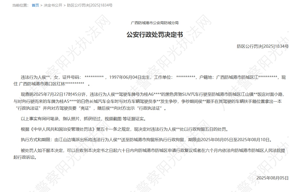 近日,当地公安机关依法对“亮证女”侯某某作出行政拘留五日的处罚决定。