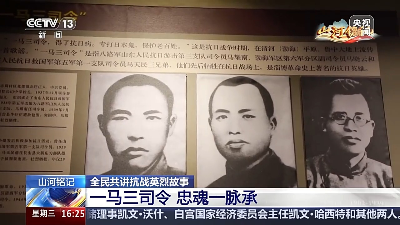 总台央视记者 张仲鲁:我现在是在淄博市烈士陵园,马耀南、马晓云、马天民三位烈士的陵墓在这里守望着他们所热爱的土地和人民。从1937年,马耀南投身抗日,到1944年马晓云壮烈牺牲,7年间,三兄弟毁家纾难,用满门忠烈诠释了什么是烈士之爱国也如家。青山埋忠骨,山河永铭记。愿今日之盛世安宁,可以告慰所有为了民族独立和国家富强而奉献的人们。