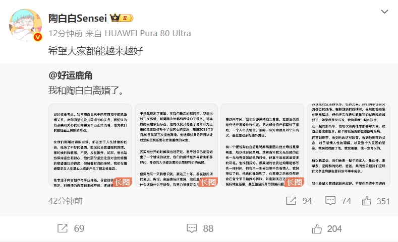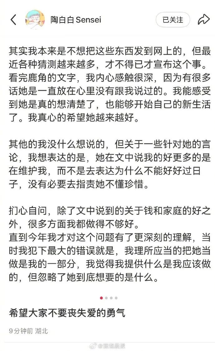 据封面新闻消息,8月6日,千万粉丝网红陶白白转发前妻@好运鹿角发布的长图,宣布两人已于两年前和平解除婚姻关系,并表示“希望大家都能越来越好”。