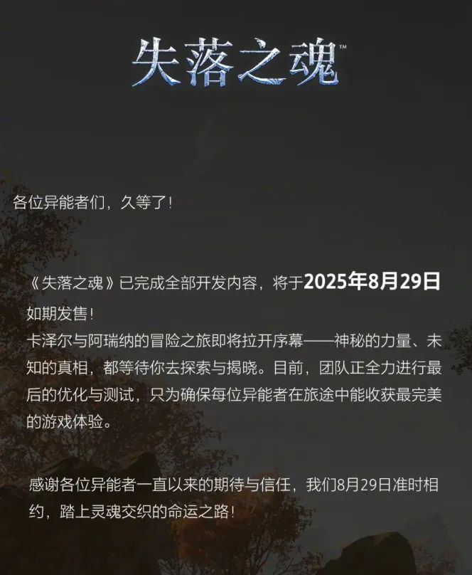 8 月 6 日消息,国产动作游戏《失落之魂》今日宣布已完成全部开发内容,将于 2025 年 8 月 29 日如期发售。