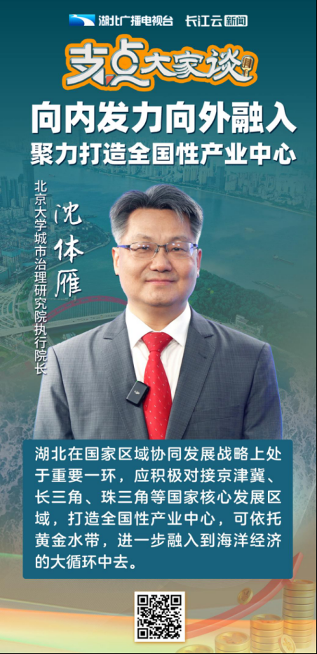 沈体雁:向内发力向外融入 建设全国性产业创新中心支点既要有中心城市带动,也要实现全域联动。大力实施区域联动战略,整体提升支点的区域协同力。近年来,湖北加快推进区域协调和城乡融合发展,建立健全武汉、襄阳、宜昌“金三角”协同发展机制,加快把武汉都市圈打造成人口超过3000万、经济总量突破4万亿的世界级都市圈,推动襄十随神、宜荆荆恩城市群跨过2万亿,带动长江中游城市群联动发展。区域联动,怎么联?如何动?长江云新闻记者专访北京大学城市治理研究院执行院长沈体雁。