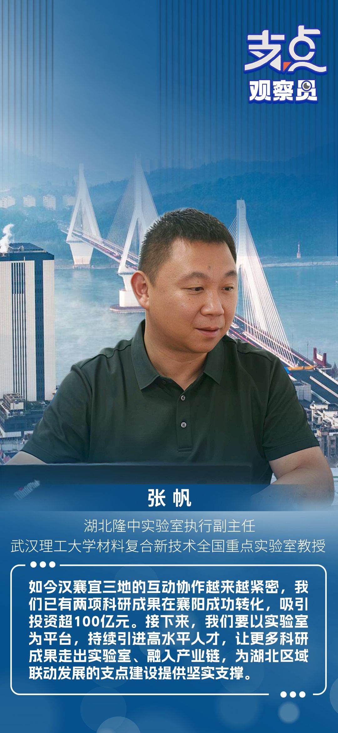 如今汉襄宜三地的互动协作越来越紧密,我们已有两项科研成果在襄阳成功转化,吸引投资超 100 亿元。接下来,我们要以实验室为平台,持续引进高水平人才,让更多科研成果走出实验室、融入产业链,为湖北区域联动发展的支点建设提供坚实支撑。