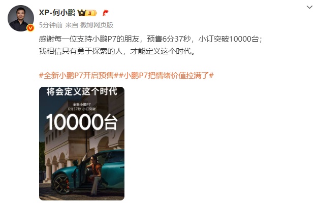 刚刚,小鹏汽车董事长、CEO何小鹏发文称:感谢每一位支持小鹏P7的朋友,预售6分37秒,小订突破10000台;我相信只有勇于探索的人,才能定义这个时代。