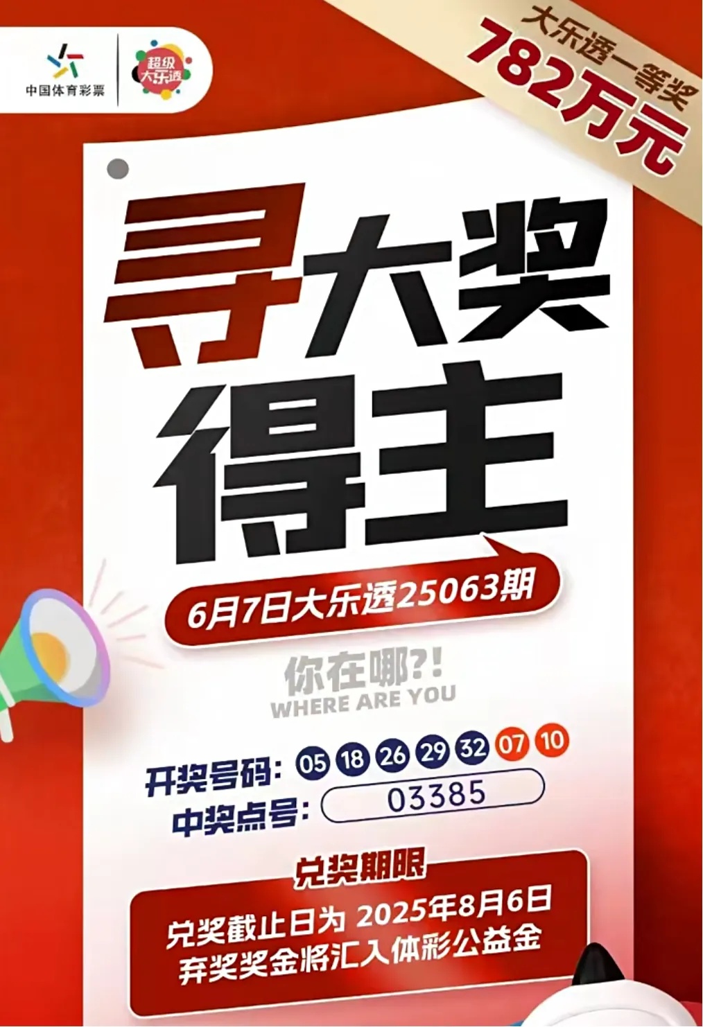 近日,体彩大乐透第25063期开奖,开奖号码为05、18、26、29、32+07、10,一等奖奖金为782万元,中奖彩票出自武汉市编号03385销售点。