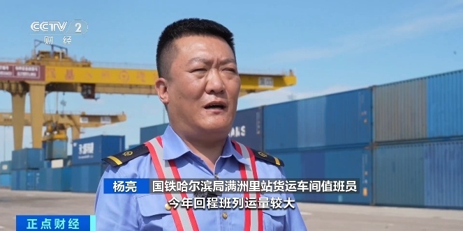 国铁哈尔滨局满洲里站货运车间值班员 杨亮:今年回程班列运量较大,跟去年相比品类也有所增加,如豆油、装饰用品、汽车轮胎等品类也是今年新增的。我们对当日可放行的回程班列,直接进行对装,减少一次落地作业,进一步提升了回程班列的运输时效。