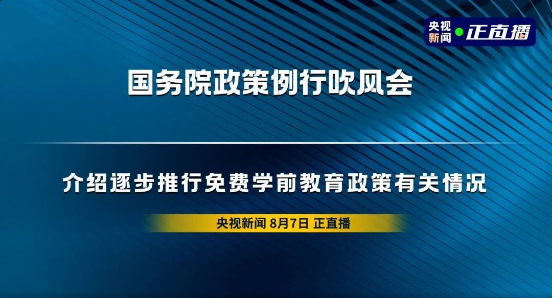 今天(8月7日)上午10时,国务院新闻办公室举行国务院政策例行吹风会,财政部副部长郭婷婷和教育部有关负责人介绍逐步推行免费学前教育政策有关情况,并答记者问。