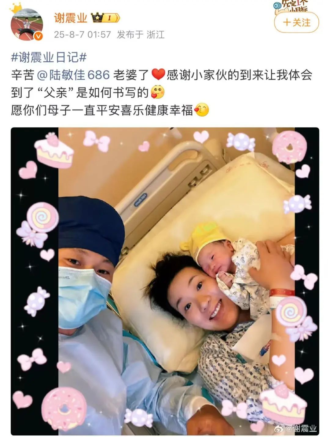 8月7日凌晨,谢震业宣布喜讯,晒出一家三口合影,称自己正式升级当爸了。