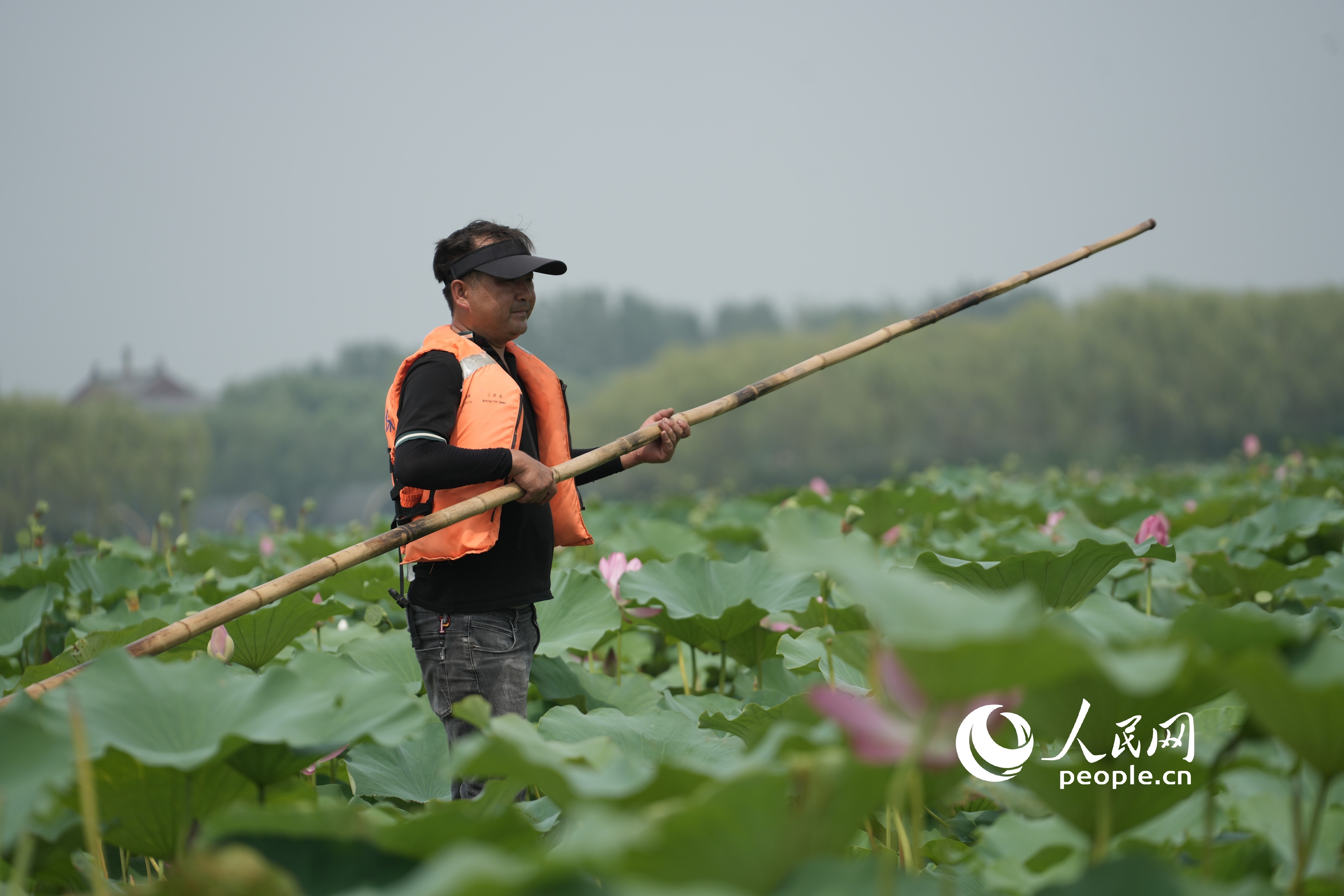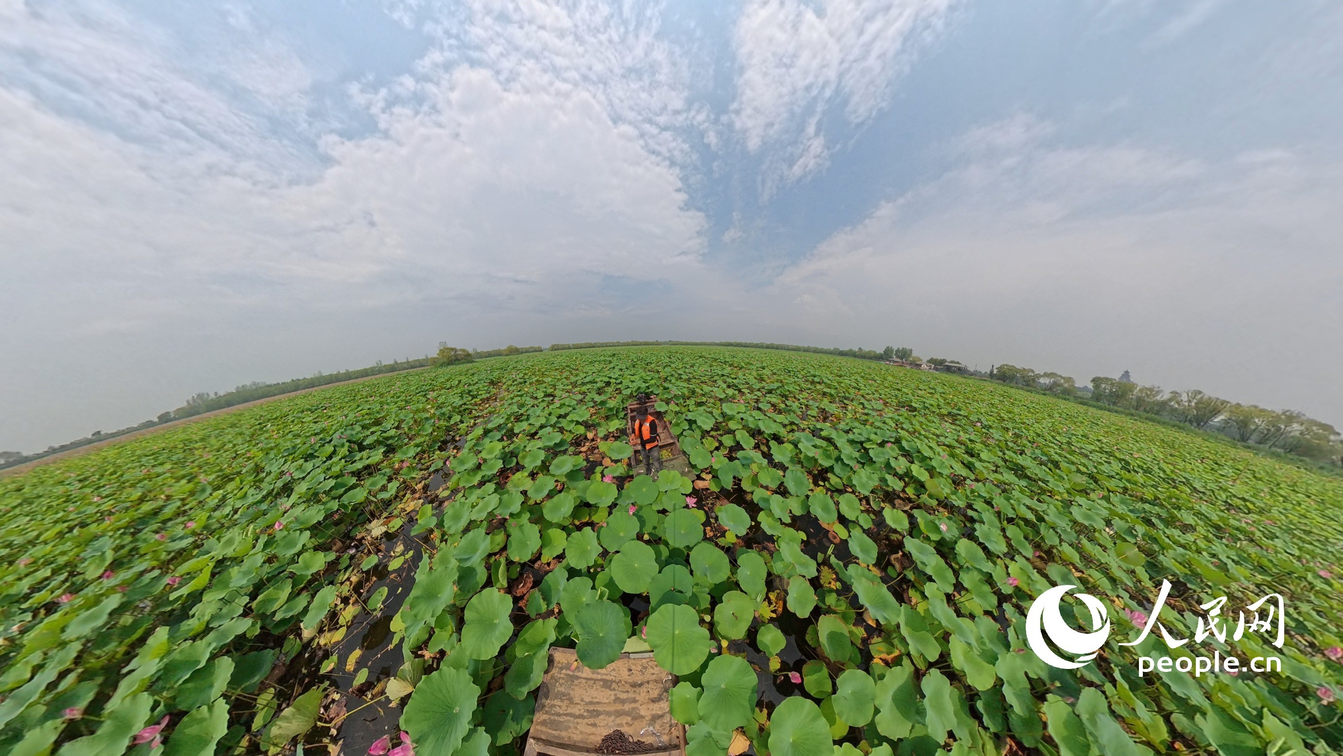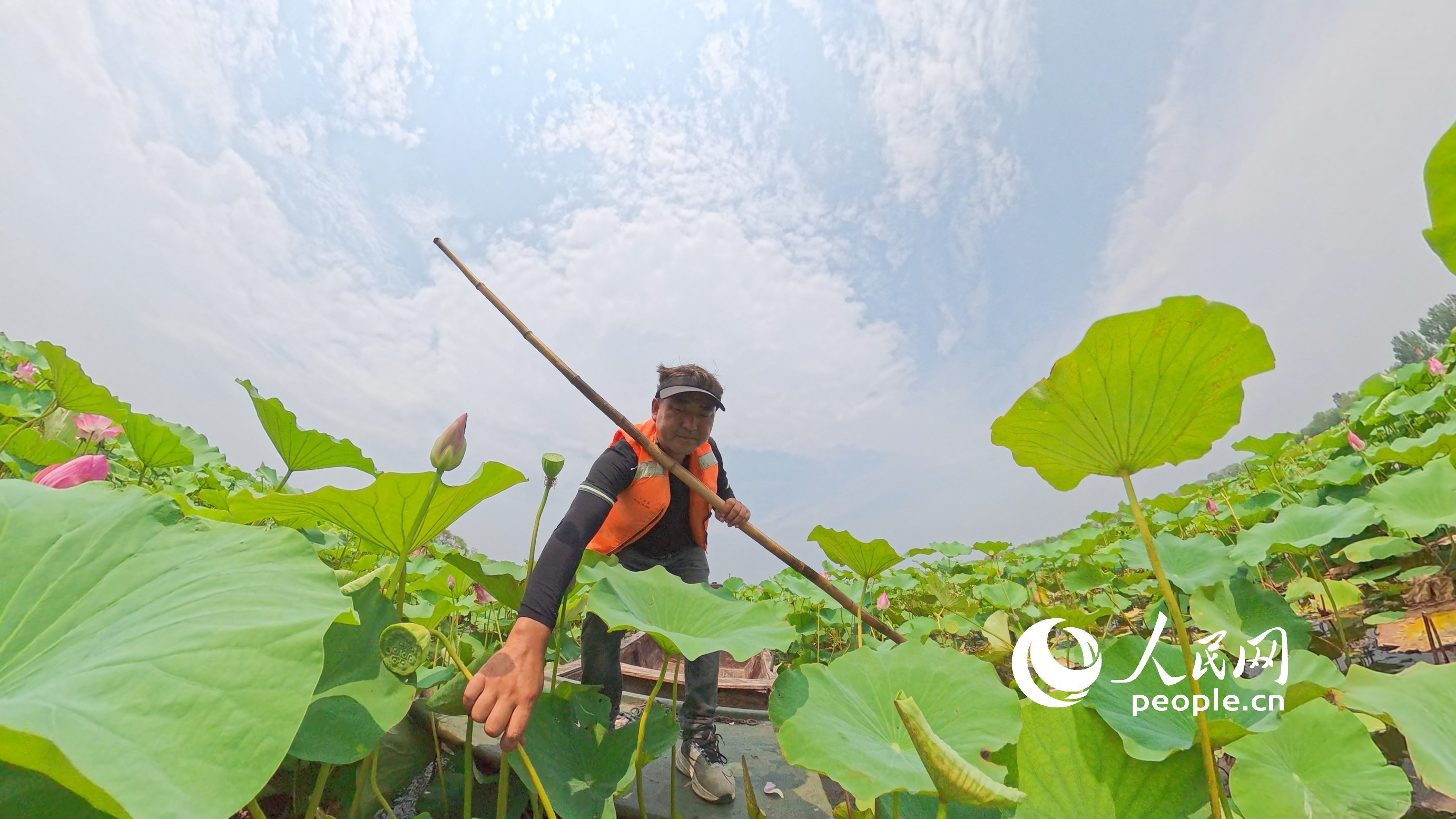 当地渔民在采摘莲蓬。人民网记者 王天乐摄
