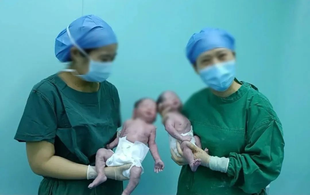 邵医生(右一)与同事抱着龙凤胎新生儿。