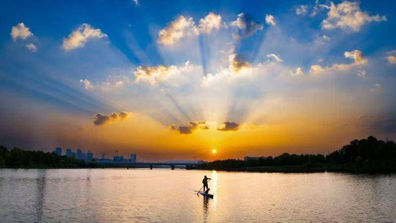 微风拂过,河面碎金闪烁,桨板人的剪影倒映水中,仿佛与自然融为一体。