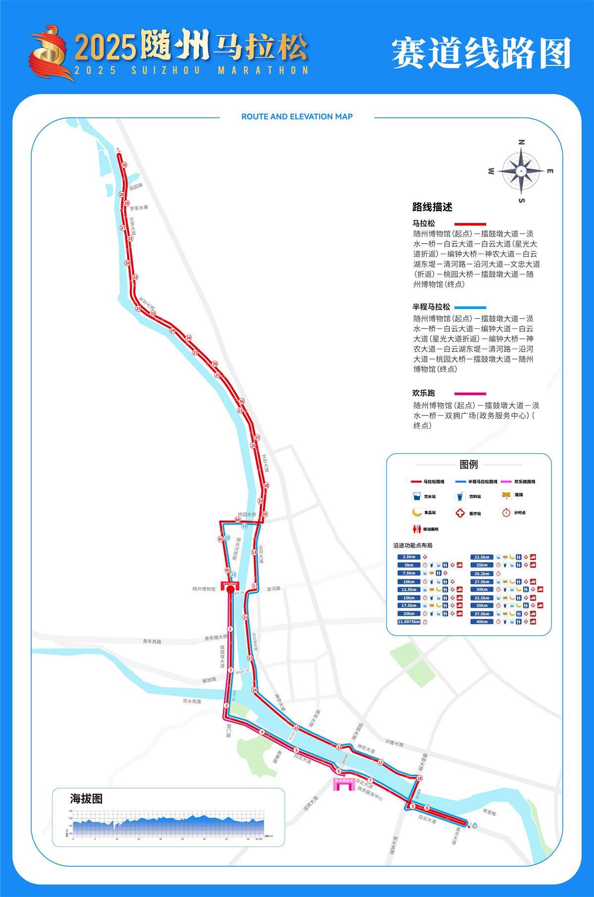 全马线路从随州博物馆出发,沿擂鼓墩大道、白云大道,折返上编钟大桥到河对岸,随后沿神农大道、白云湖东堤到达清河路转弯,再从沿河大道一路向北,到文忠大道折返,最终经桃园大桥回到随州市博物馆。