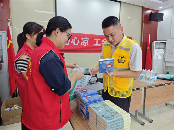 工会志愿者给外卖员发放书籍。 通讯员供图