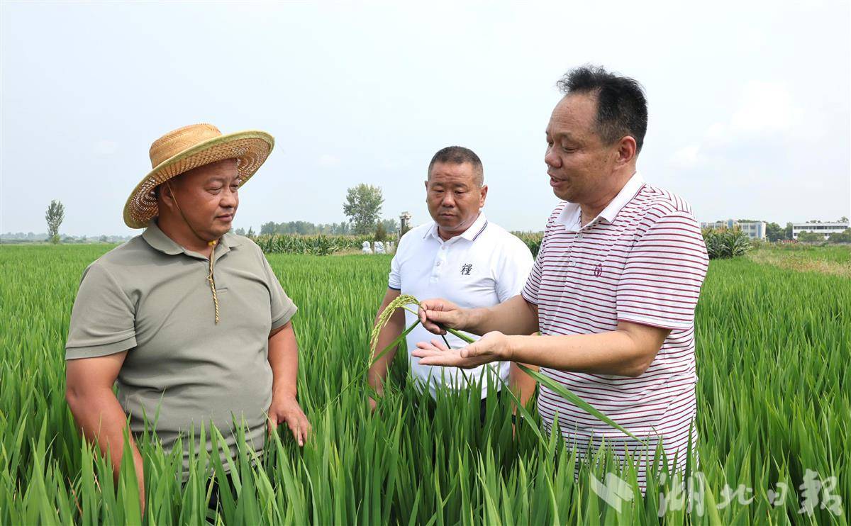 8月7日酷暑高温,枣阳市琚湾镇马岗村水稻田里,农技人员(右一)传授种植户旱情期水稻农技管理。