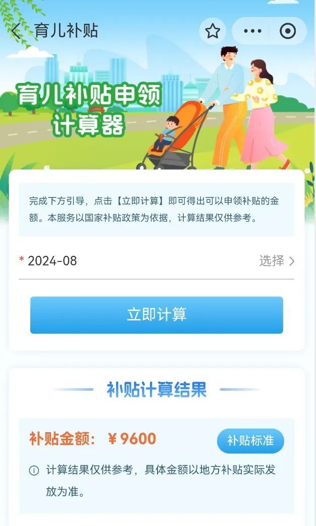 2025年1月1日前出生、不满3周岁的婴幼儿,也可享受补贴,按月数折算领取相应金额。支付宝“育儿补贴”小程序也上线了“育儿补贴计算器”功能,帮助用户轻松计算补贴金额。例如,2024 年 8 月出生的娃,共计可领取 9600元。