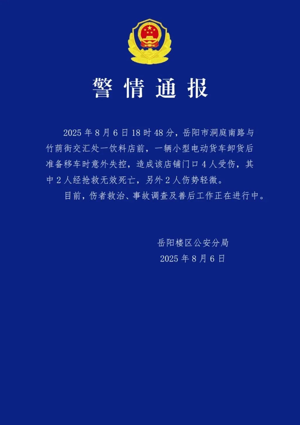 同日,岳阳楼区公安分局发布通报称,目前伤者救治、事故调查及善后工作正在进行中,并称涉事小型电动货车是在卸货后准备移车时意外失控。