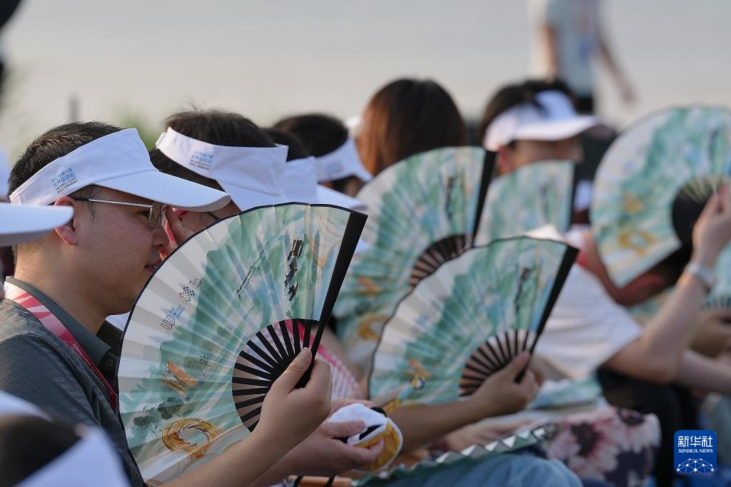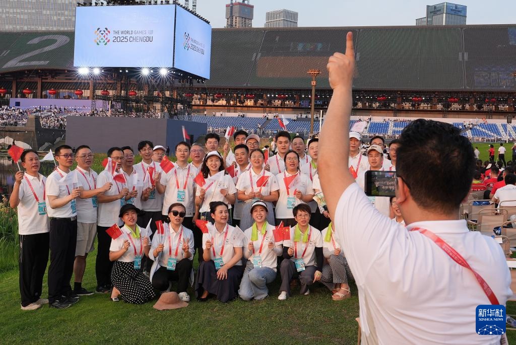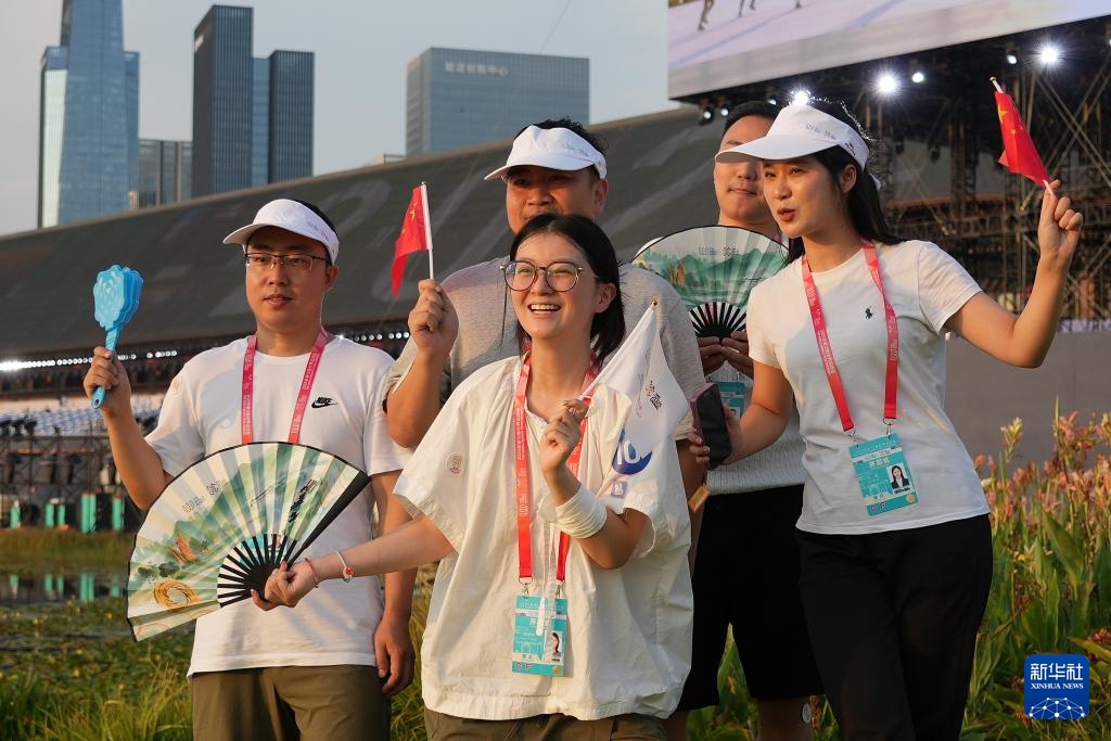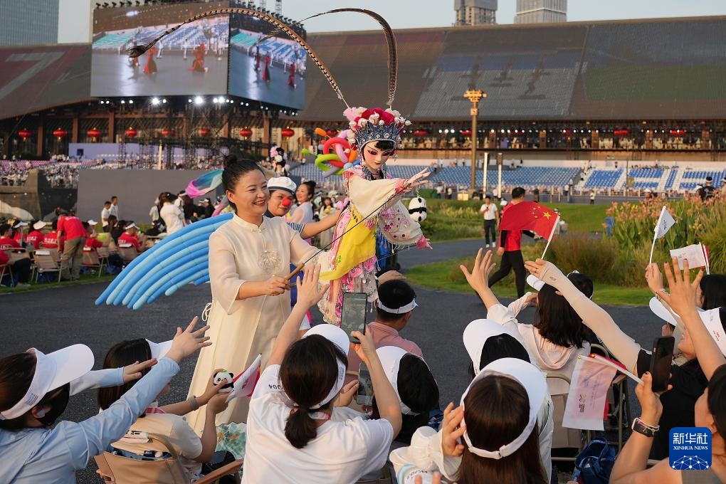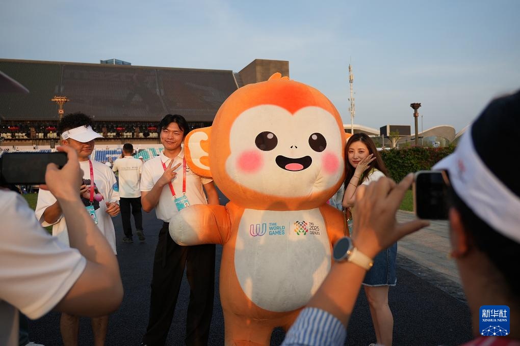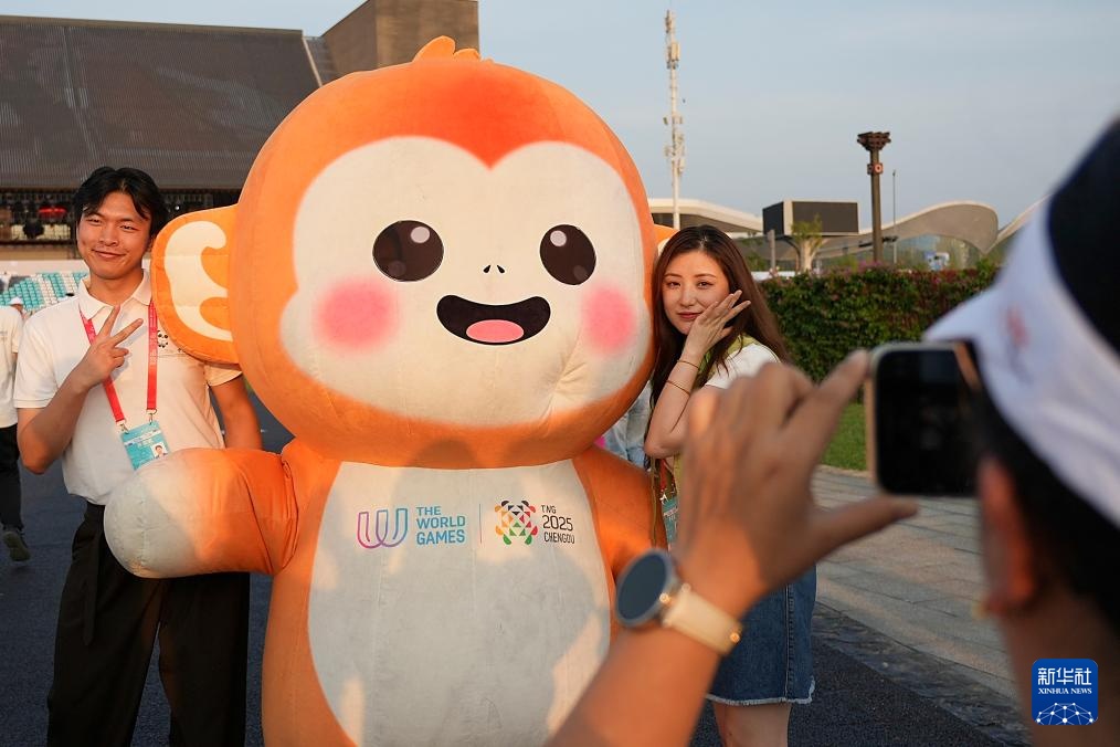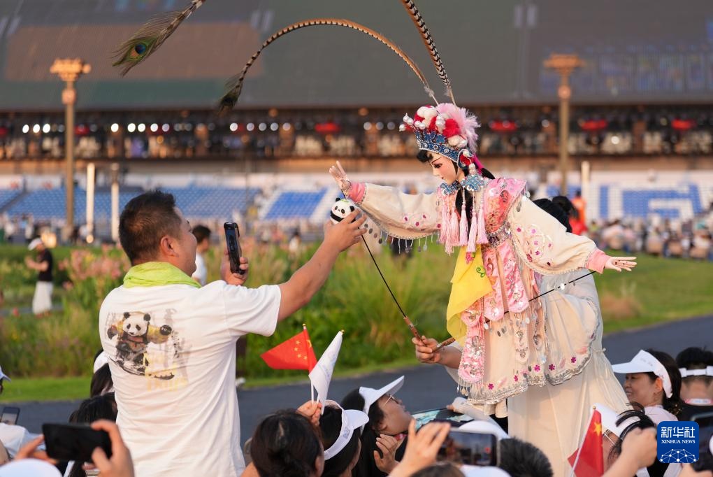 8月7日,观众在开幕式前与吉祥物“锦仔”合影。