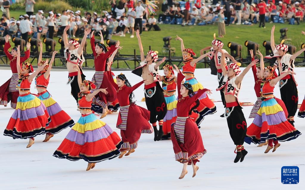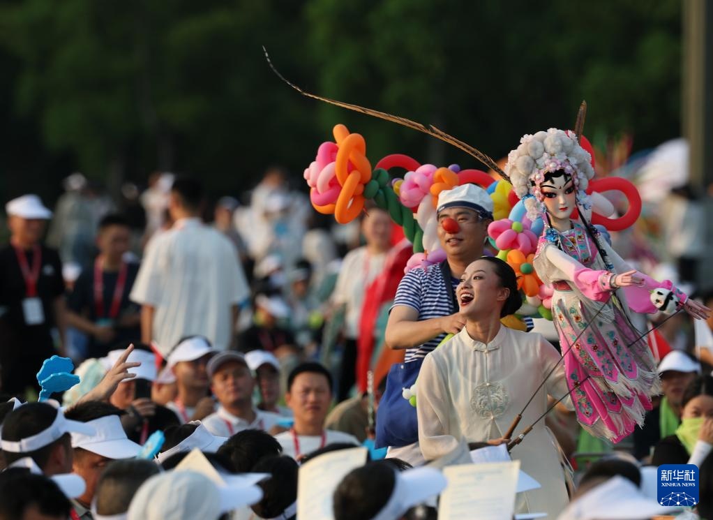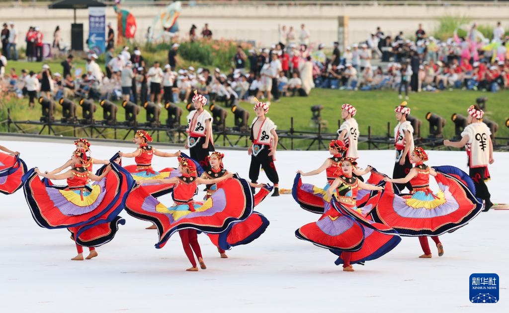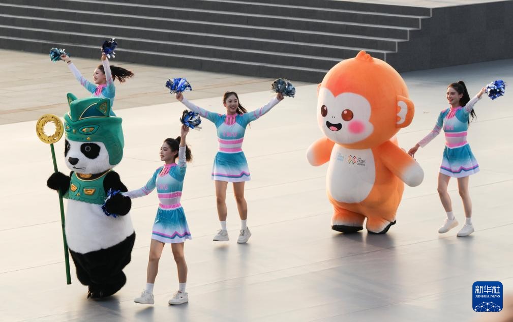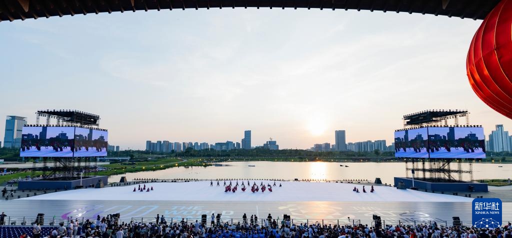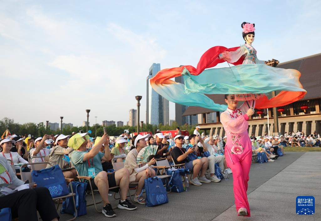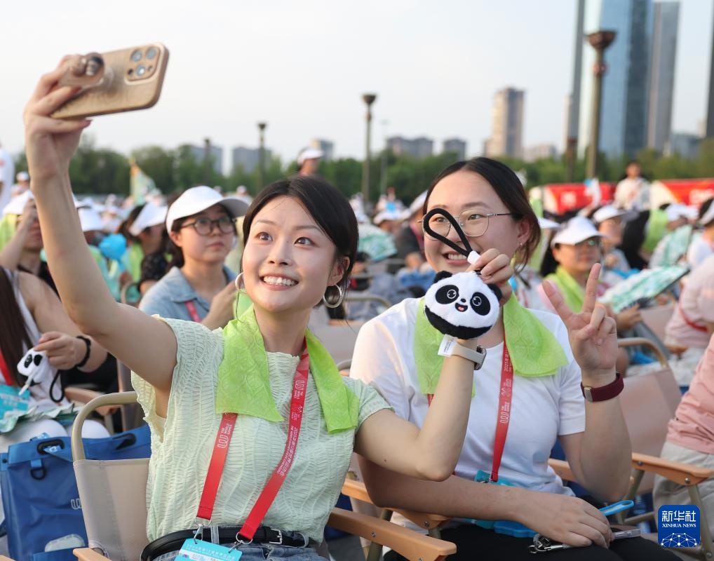 8月7日,观众在开幕式前与吉祥物“锦仔”合影。