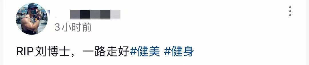 8月6日,有网友在社交平台爆料,健美选手刘博士去世,年仅38岁。爆料中附上了一张朋友圈截图:“听说刘一阳没了?猝死的,我前两天看他在备赛”。另有网友发朋友圈截图称健美圈业内人士鹿晨辉也发布动态,并配文“08年第一次同台,快要20年过去了,博士一路走好”。极目新闻记者也在社交平台看到,多位网友发布视频,配文“RIP刘博士一路走好”,以表哀悼。