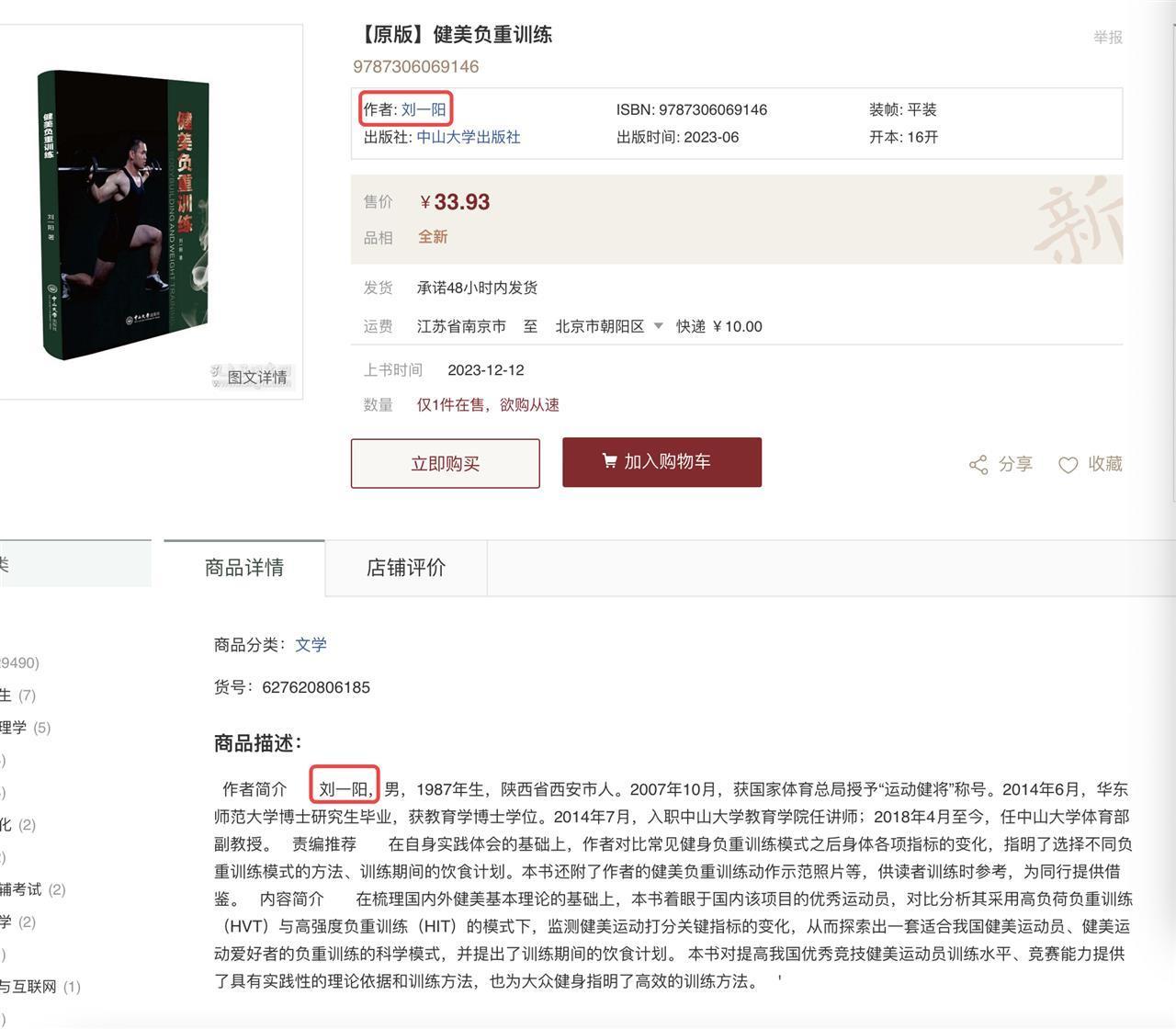 刘先生还介绍,刘一阳曾写过一本书,名为《阳刚健美》。极目新闻记者查询发现,《阳刚健美》是由刘一阳和刘兴刚编著的健美运动指导书籍,于2010年7月由珠海出版社出版,该书定位为具有中国特色、适应中国人人体机能的健美训练读物。此外,刘一阳还著有《健美负重训练》一书,由中山大学出版社2023年6月出版,在该书简介中,有对作者刘一阳的详细介绍。