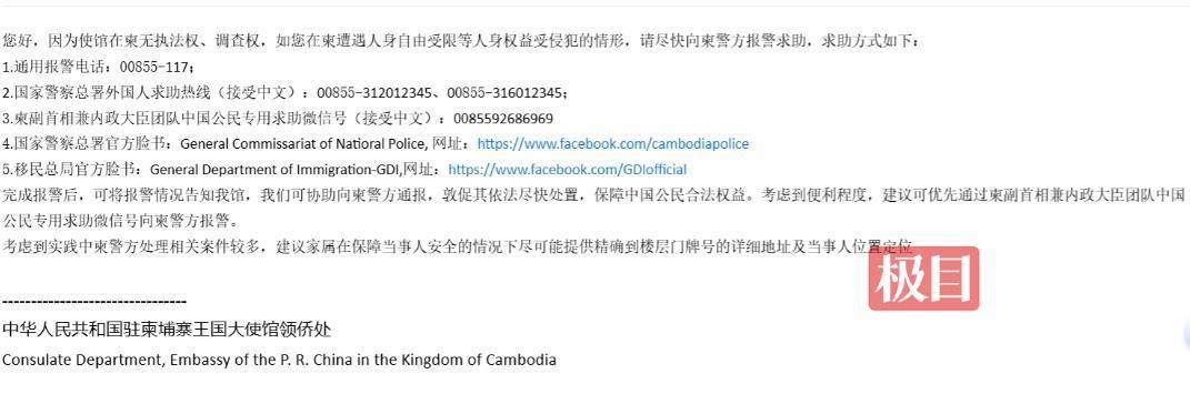吕女士称,她此前在中国驻柬埔寨王国大使馆的官网上了解到了对方的邮箱地址并发了求助信,中国驻柬埔寨王国大使馆领侨处分别在7月8日和7月29日给她回了两封电子信件。第一封信中写道:我们高度重视每一位在柬中国公民合法权益保护,建议您一方面通过当事人经常使用的各种社交媒体尝试沟通,问清楚当事人精确到楼层门牌号的位置信息。另一方面同国内警方联系,确认是否有其他合作渠道或技术手段。有具体位置后请第一时间同我馆联系,我馆会告知您在柬相关报警方式。在第二封信中,中国驻柬埔寨王国大使馆领侨处给吕女士提供了柬埔寨警方联系方式,并称可协助向柬警方通报,敦促其依法尽快处置,保障中国公民合法权益。