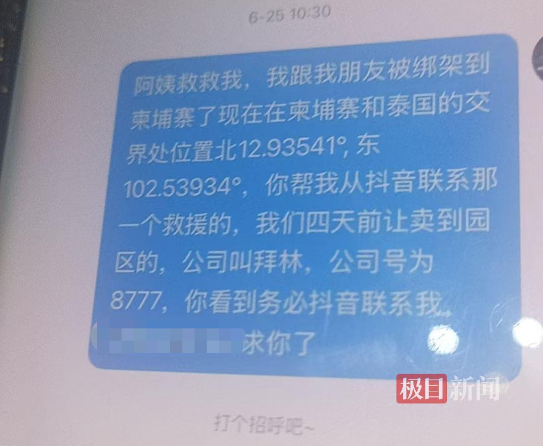 记者获得的另外一张聊天截图显示,6月25日,与贾珺勃一起去柬埔寨的另一人曾在某短视频平台给自己母亲的朋友发私信求救,称自己和朋友被绑架到柬埔寨,并称“四天前被卖到园区,公司叫拜林,公司号为8777”。据了解,拜林为柬埔寨的一个市,位于柬埔寨西边,靠近泰国边境。