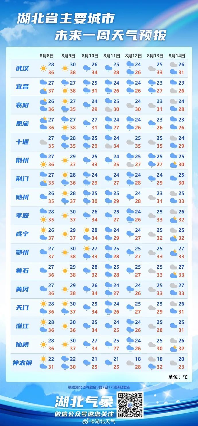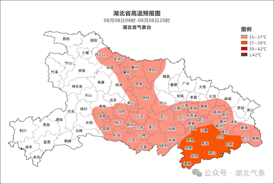 预计明天(8日)白天,襄阳、宜昌东部、荆门、荆州、天门、仙桃、潜江、孝感南部、武汉、鄂州、黄冈、黄石、咸宁等地气温将升至35℃以上,其中武汉南部、鄂州、黄石、咸宁可达37℃,请注意防范。
