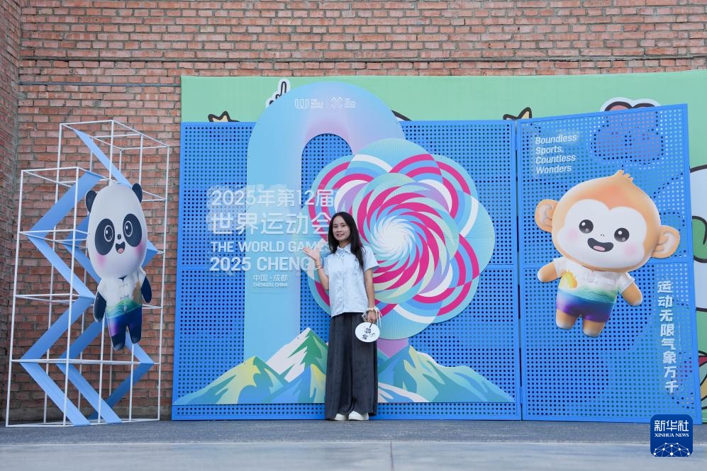 8月7日,在成都东郊记忆·成都国际时尚产业园,游客在成都世运会主题展板前留影。新华社记者 李旭伦 摄