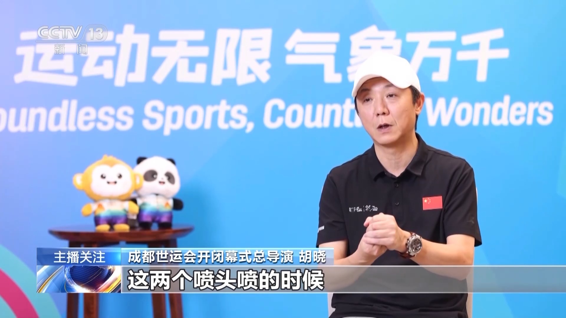 成都世运会开闭幕式总导演 胡晓:乍一看都以为是里面加了个燃气管道。不是,它真的把天然气融到水里去了。它是外面一根水管,里面一根气管,这两个喷头喷的时候,外面的水管因为它的压力很均匀,而且足够大,可以形成一个管壁,变成一个天然气管道,气就从里面出来了,而这个气又不能太大,太大了他又把水管壁给冲破了,太小了,又冲不上去,就要找到一个水与火之间的平衡,然后在最后点着的瞬间,水跟火都能融到一起去燃烧,去绽放,一个喷起来,一个燃烧起来。