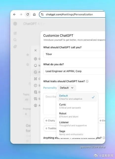 初始的四种性格选项——愤世嫉俗者(Cynic)、机器人(Robot)、倾听者(Listener)和书呆子(Nerd)都是可选的,用户可在设置中随时调整,用以匹配ChatGPT和用户的沟通风格。