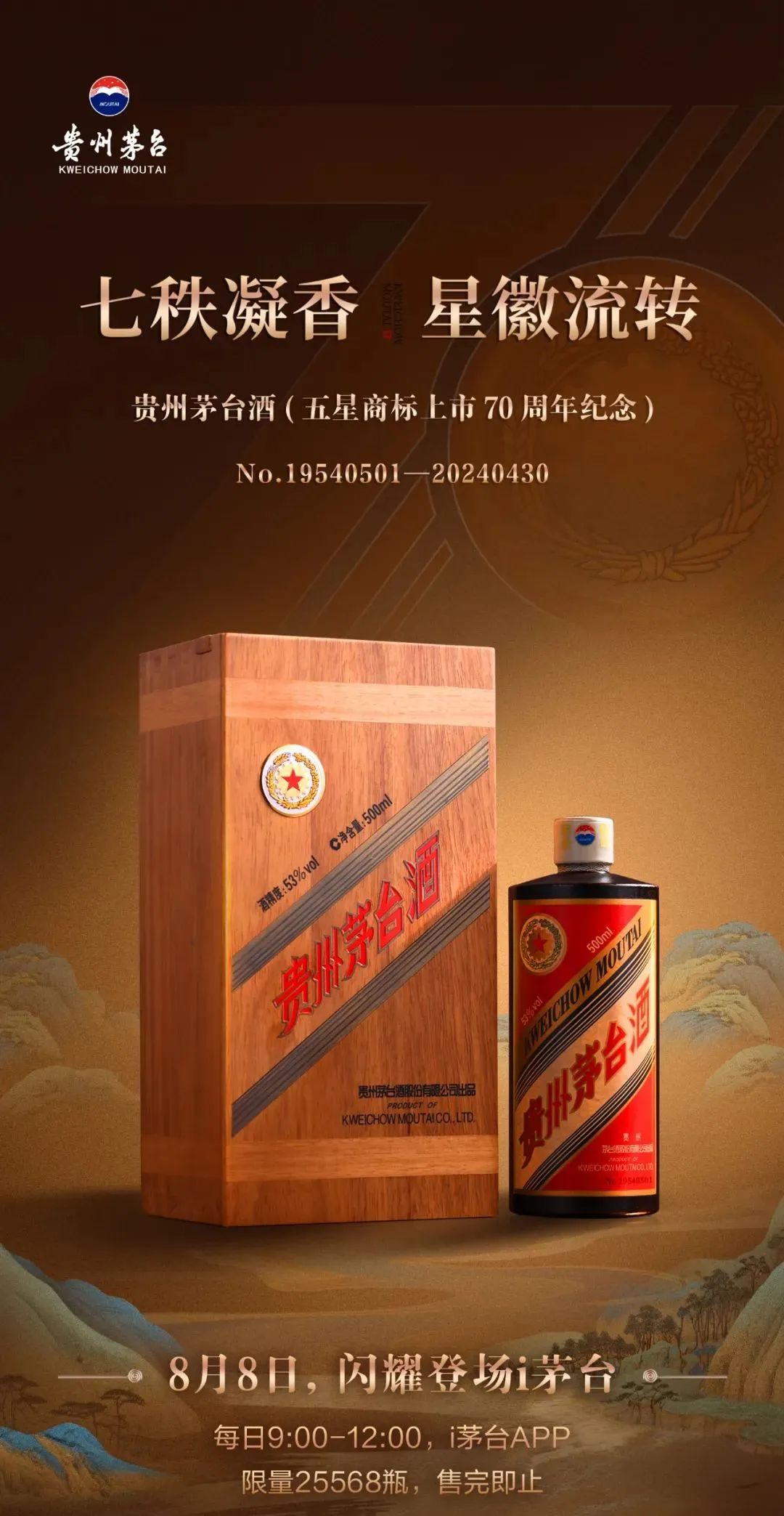 8月8日,贵州茅台酒(五星商标上市70周年纪念)正式上架i茅台平台,单瓶售价为7000元,限量25568瓶,与此前传闻的售价相符。