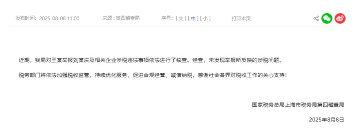 国家税务总局上海市税务局第四稽查局8月8日通报,近期,该局对王某举报刘某庆及相关企业涉税违法事项依法进行了核查。经查,未发现举报所反映的涉税问题。