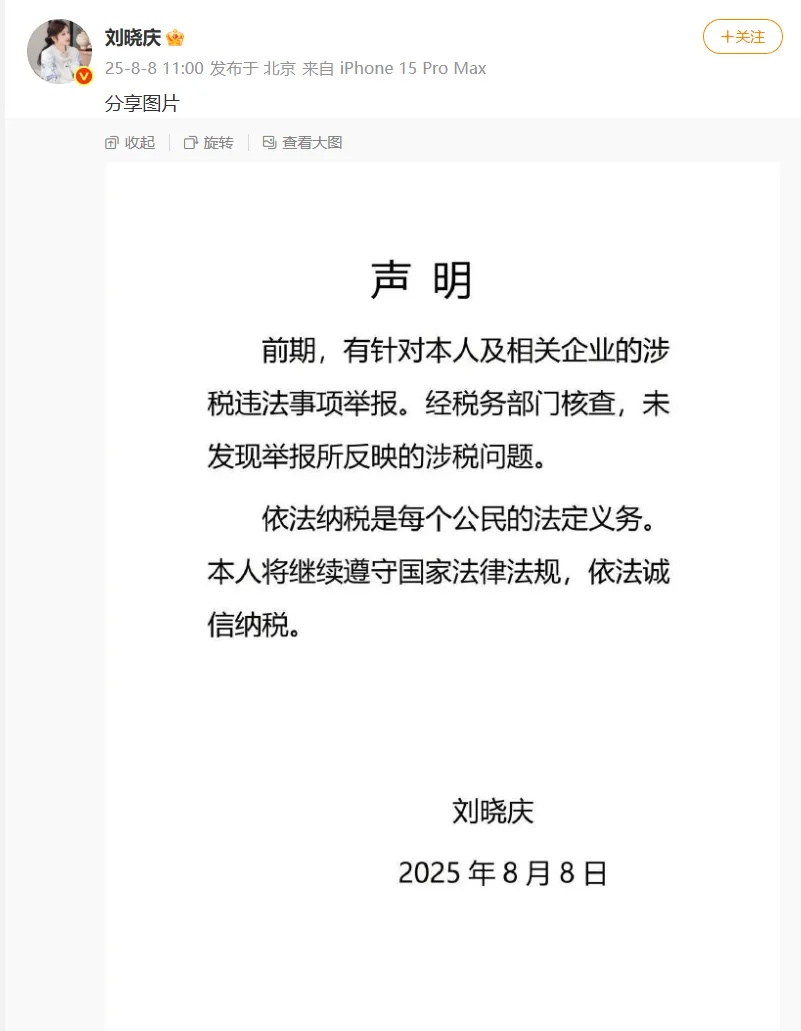 同日,刘晓庆发文称,“前期,有针对本人及相关企业的涉税违法事项举报。经税务部门核查,未发现举报所反映的涉税问题。依法纳税是每个公民的法定义务。本人将继续遵守国家法律法规,依法诚信纳税。”