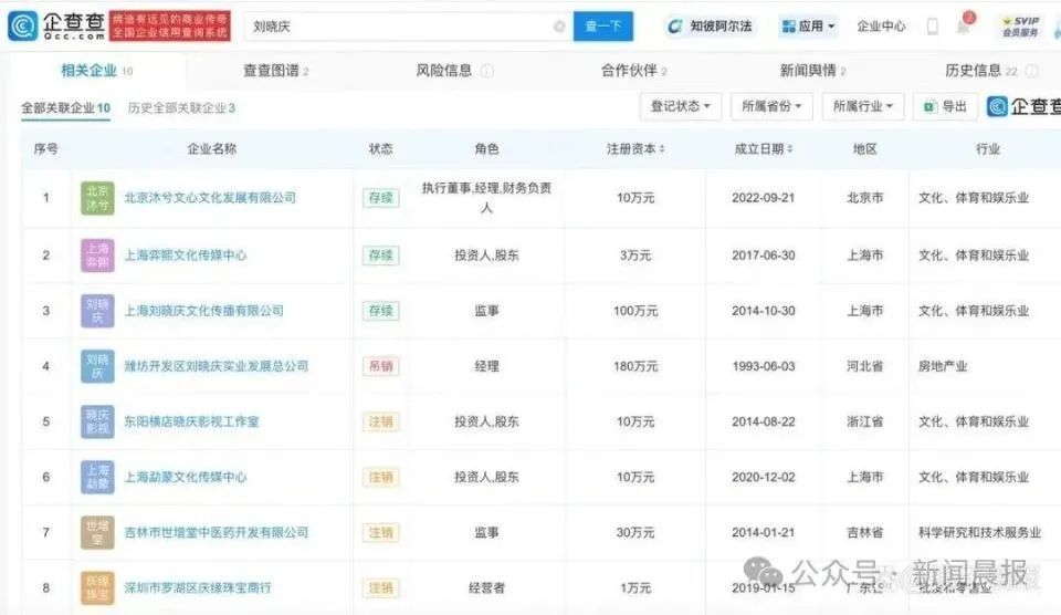 企查查信息显示,刘晓庆名下关联10家企业,7家为吊注销状态,仅3家公司存续,行业均涉及文化、体育和娱乐业。其担任被指控的上海弈熙文化传媒中心投资人角色,该公司成立于2017年6月,出资额3万元