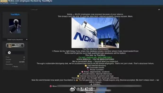 近日,据外媒 Gbhackers报道,黑客组织 Tsar0Byte 在暗网论坛 DarkForums 宣称,其利用了第三方承包商的基础设施漏洞,套取了诺基亚公司系统的访问权限。