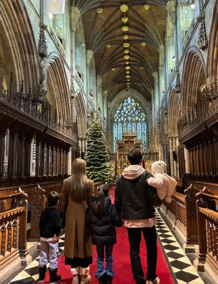 视频中,昆凌牵着2个孩子,周杰伦抱着最小的宝宝,一家五口画面温馨有爱。