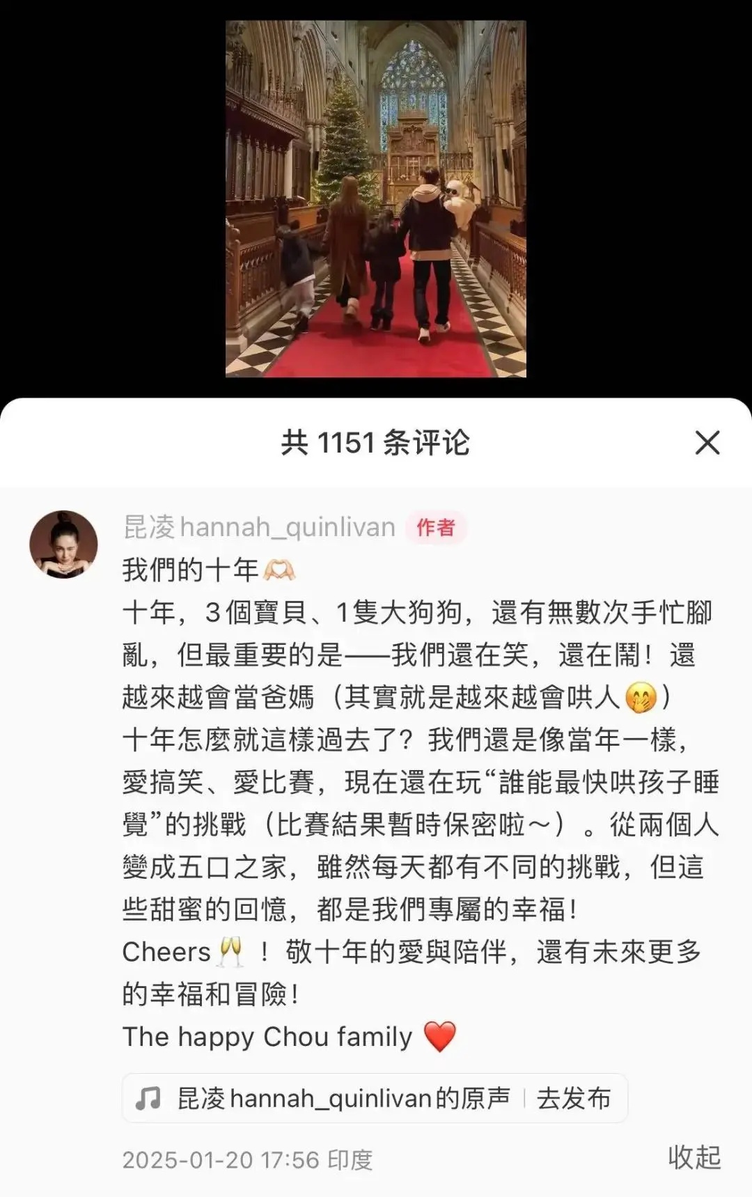 周杰伦昆凌是不少网友眼中的“模范夫妻”。2025年1月20日下午,昆凌在社交平台晒出和周杰伦携儿女重游当年婚礼教堂的视频,纪念结婚十周年。