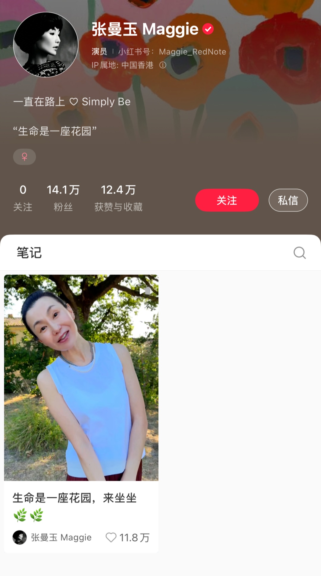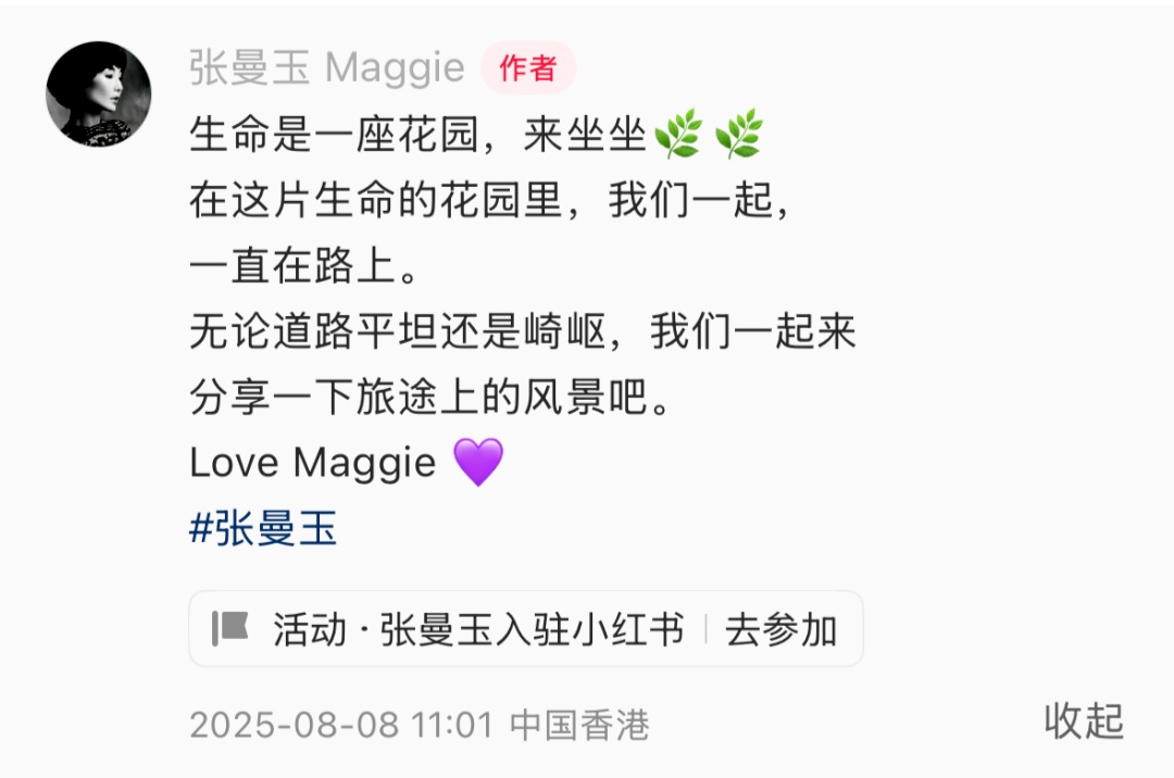 8月8日,久未露面的张曼玉发布一条1分多钟的视频,宣布正式入驻小红书,她在配文中写道:生命是一座花园,来坐坐。在这片生命的花园里,我们一起,一直在路上。无论道路平坦还是崎岖,我们一起来分享一下旅途上的风景吧。