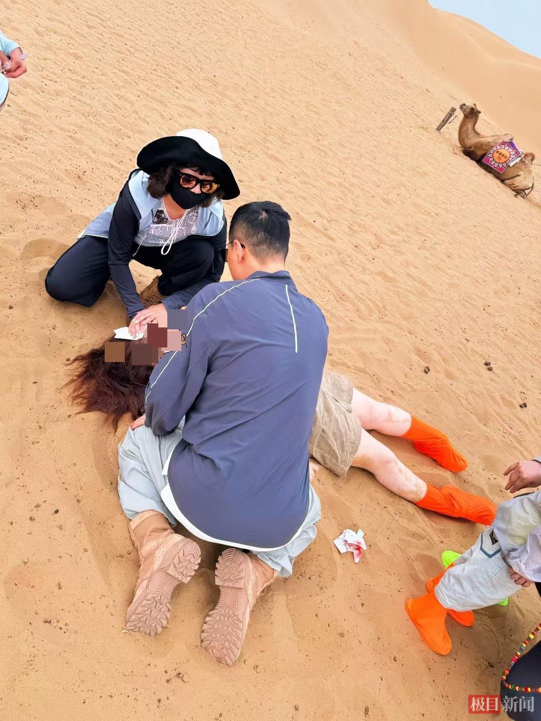 “我们当时都在体验骑骆驼,他们离我们20米左右。”唐晓艳回忆,当日下午,她在游玩时看到旁边一名30多岁的女游客带着3岁儿子体验景区骆驼骑行项目时,因骆驼受惊,母子二人不慎从驼背上坠落倒地。“儿子先摔下来的,母亲在儿子摔下来的同时用身体护住了儿子,我看到后,来不及多想,第一时间和老公一起冲了过去。”唐晓艳说,丈夫杜锐一边快速向受伤母子奔去,一边高声表明身份:“我是医生!”这简短四字成为“最快通行证”,二人随即来到伤者身旁。