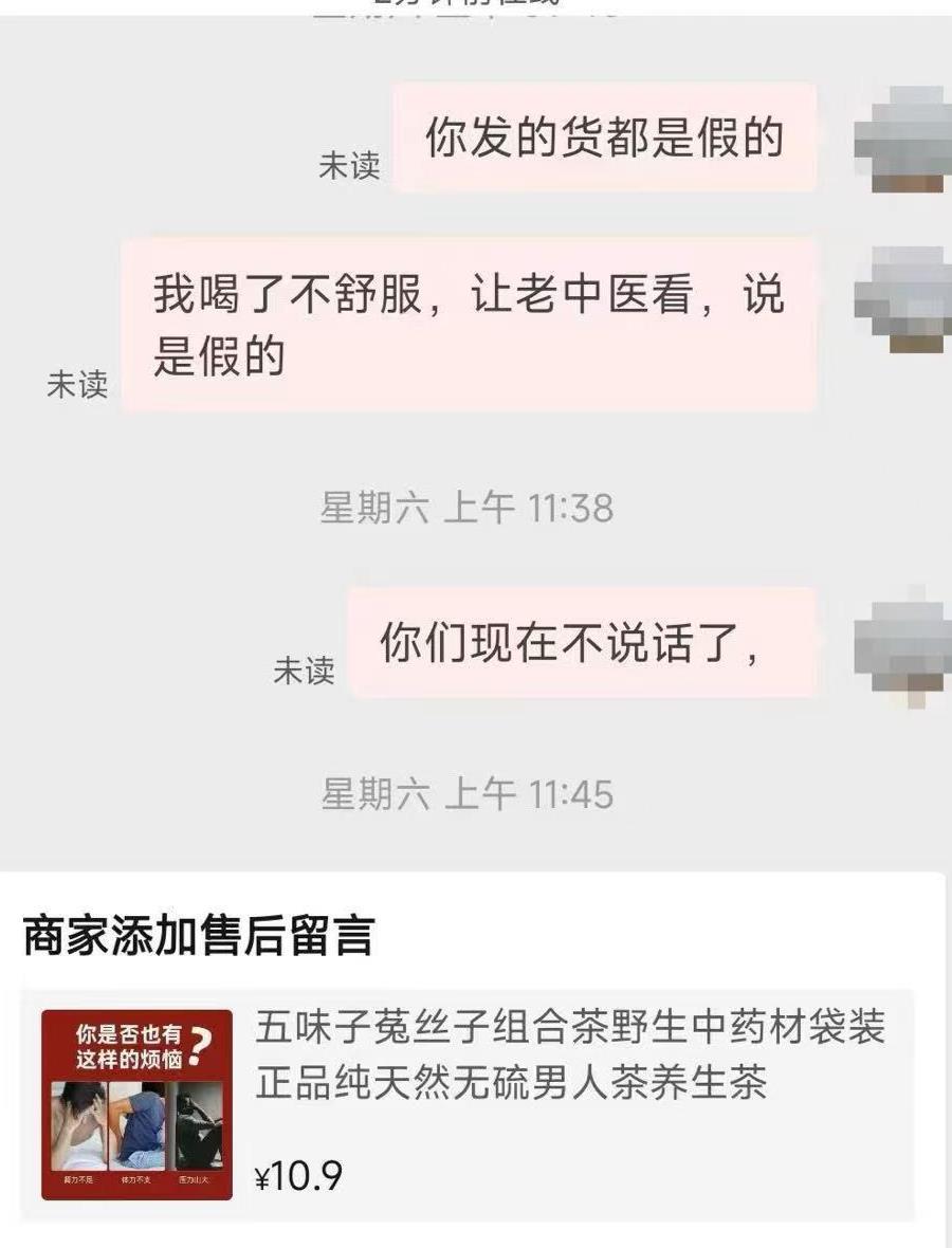 网购的中药居然是假药?8月6日,河北消费者周先生向极目新闻热线027-86777777反映,他在网上购买了一袋组合茶野生中药材,喝了3天后发现自己头晕恶心,去当地中医院看病,不料中医院的医生说网上购买的这两种药材是假药,长期喝会危及生命,让周先生后怕不已。
