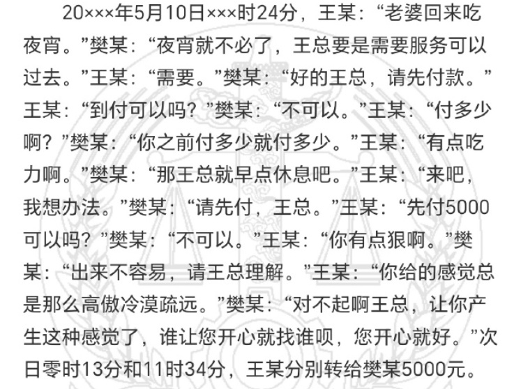 从款项交付情况看,王某向樊某转账的时间没有任何规律,不具有定期支付包养费用的特征。转账金额中除了第一次为1300元以及几笔千元以下外,每笔或者每日转账金额至少在5000元以上,符合樊某主张的服务价格。另外,王某曾经通过微信及欠条形式确认欠付樊某款项,该行为明显不符合情人关系特征,反而印证了樊某关于王某拖欠服务费的说法。