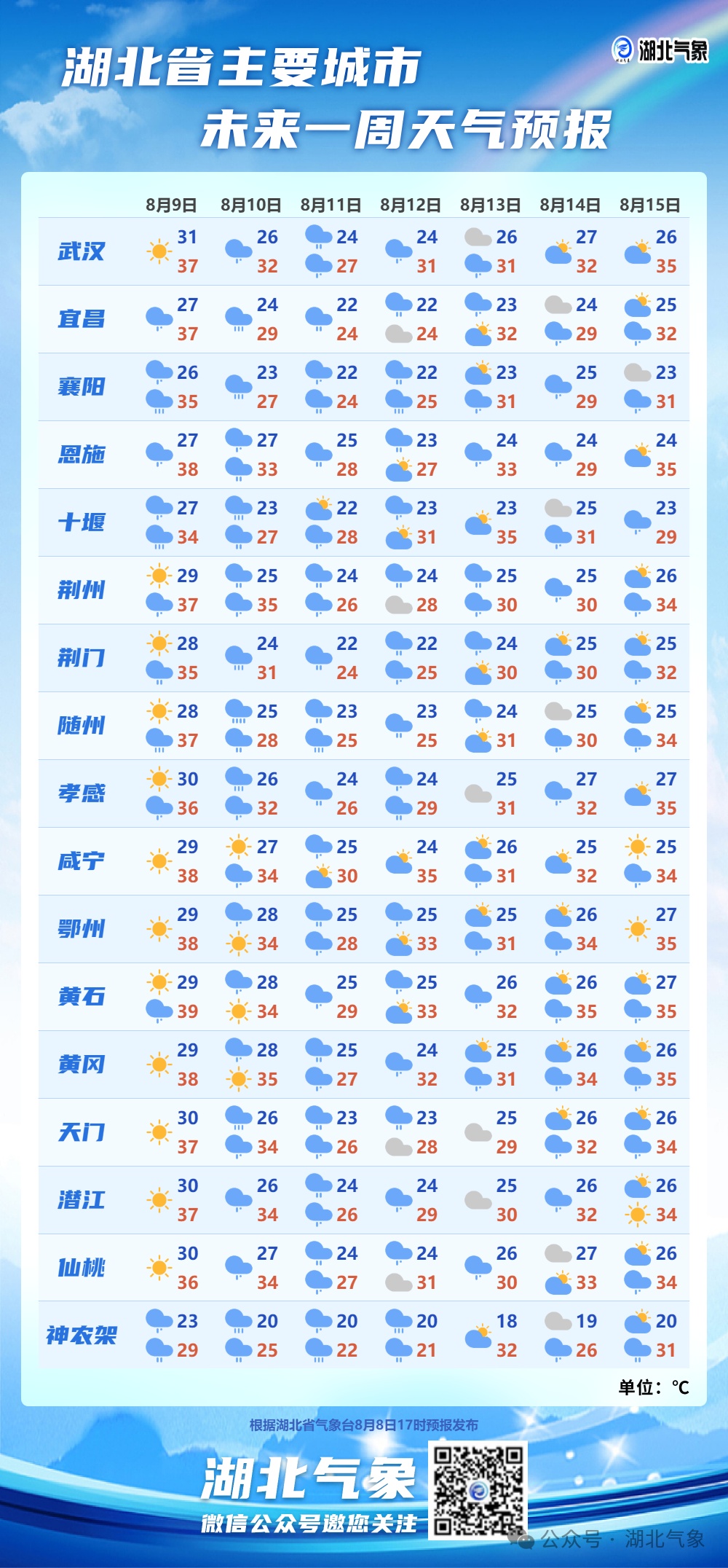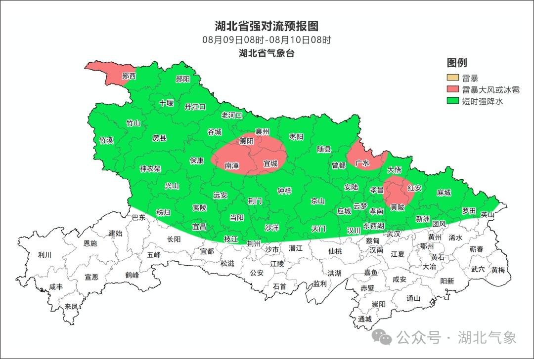 预计今天午后到夜间,十堰、襄阳、随州、神农架、宜昌北部、荆门、孝感、武汉北部、黄冈北部等地有短时强降水(最大小时雨强50~100毫米)、局地有雷暴大风(8~11级)等强对流天气,请注意防范。