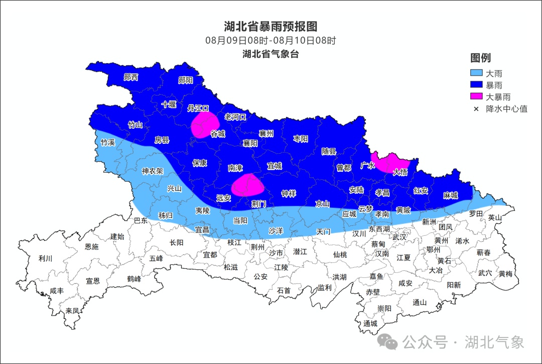 预计今天午后到夜间,十堰、襄阳、随州、神农架、宜昌北部、荆门、孝感、武汉北部、黄冈北部等地将有大雨到暴雨,其中十堰、襄阳、随州、孝感、宜昌、荆门局地有大暴雨,请注意防范。