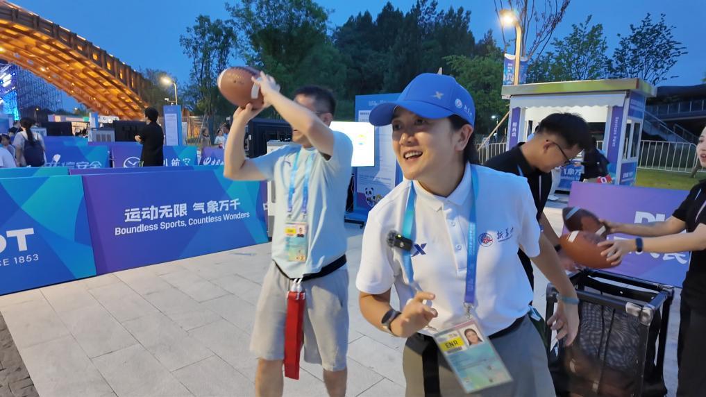 两位记者在世运广场上比拼了腰旗橄榄球、抛竿和飞盘三个项目,来看看他们谁将获胜呢?