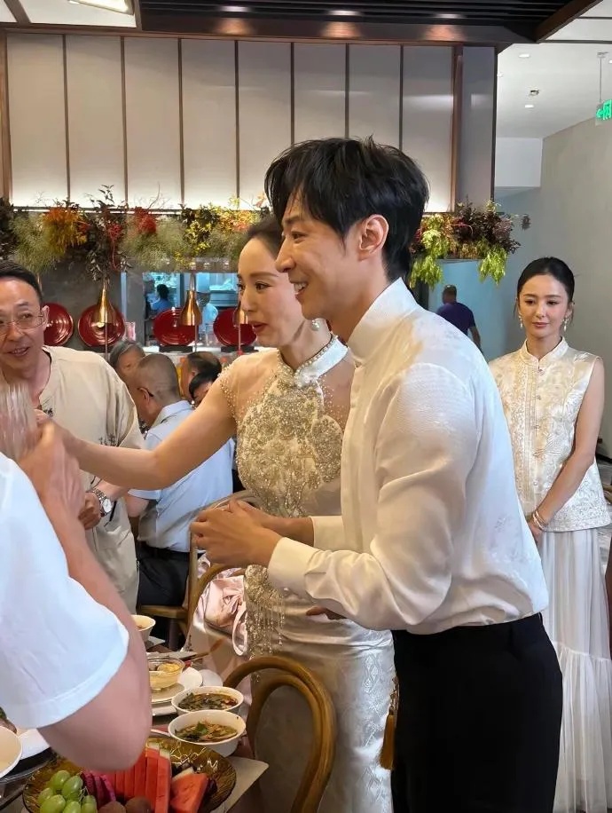 据此前报道,7月15日,董璇在综艺中公开自己再婚消息。7月16日,网友曝光的婚宴现场照片中,董璇身着一袭素雅白旗袍,张维伊则以简约白衬衫搭配黑色西裤现身。