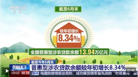 截至6月末,全国普惠型涉农贷款余额13.94万亿元,较年初增长8.34%;全国粮食重点领域贷款余额5.1万亿元,较年初增长13.5%。今年1-6月全国新发放的普惠型涉农贷款平均利率同比下降0.61个百分点,继续保持下降趋势。