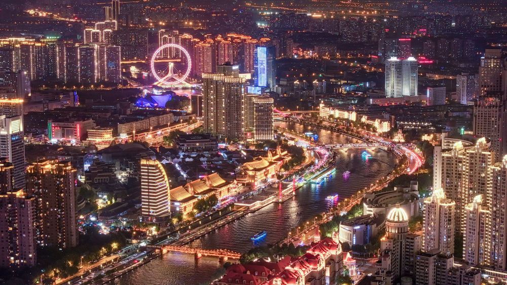 夜幕降临,海河两岸璀璨绚丽、千变万化:高层建筑披上灯光外衣,勾勒出两岸高低协调、错落有致的天际线;跨越在海河两岸的座座桥梁,如长虹卧波、玉带蜿蜒;游人排队乘坐永乐桥“天津之眼”摩天轮,座舱升至最高处,可将大半座城市的繁华尽收眼底……