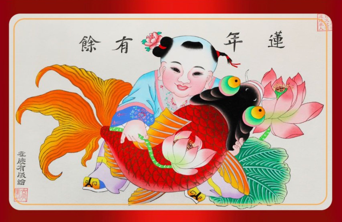 《莲年有余》是杨柳青年画中最受欢迎的图样。国家级非物质文化遗产传承人霍庆顺介绍,图样中的鱼现实中其实是不存在的,它是取金鱼之尾、鲫鱼之身、鲤鱼之头——将三种鱼的经典特质融于一体,这正是“和合”吉祥寓意的生动表达。