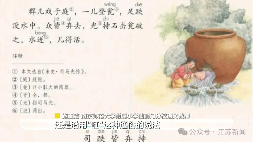 据南京师范大学附属小学仙鹤门分校语文教师施玉洁介绍,“司马光砸缸” 改 “砸瓮” 是被误传的,实际上教材里还是沿用 “缸” 这种通俗的说法。而 “砸瓮” 说来自《宋史》记载司马光 “破瓮救儿”,因为宋代的 “瓮” 指的是小口大腹的容器,“缸” 是后世的泛称。因此,课本会在注释里标注原文,这是兼顾了普及性和准确性。